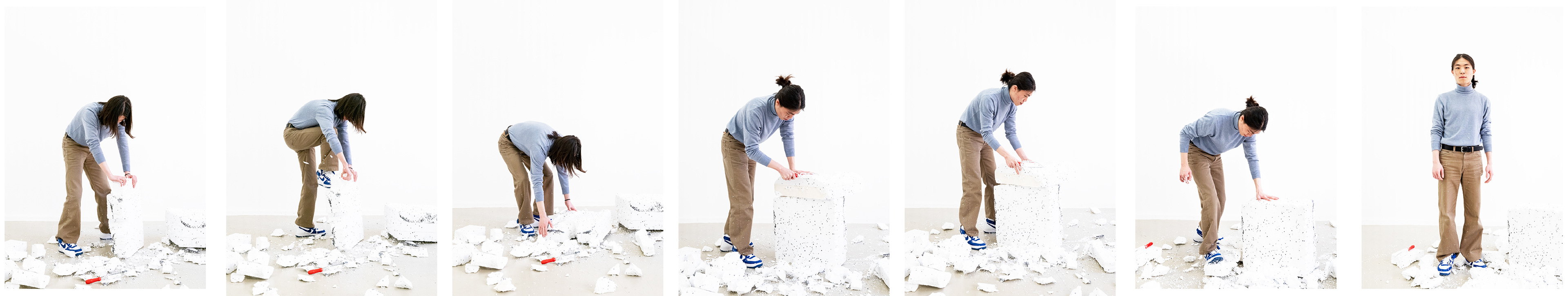 오르거나 내려가거나 또는 허우적 거리거나 Going up↑& down↓ , and floundering ‹~ ~› (Performer KIM Chanmin) archival inkjet print 8 pieces of different depths of wood panels each 32x42cm 2022